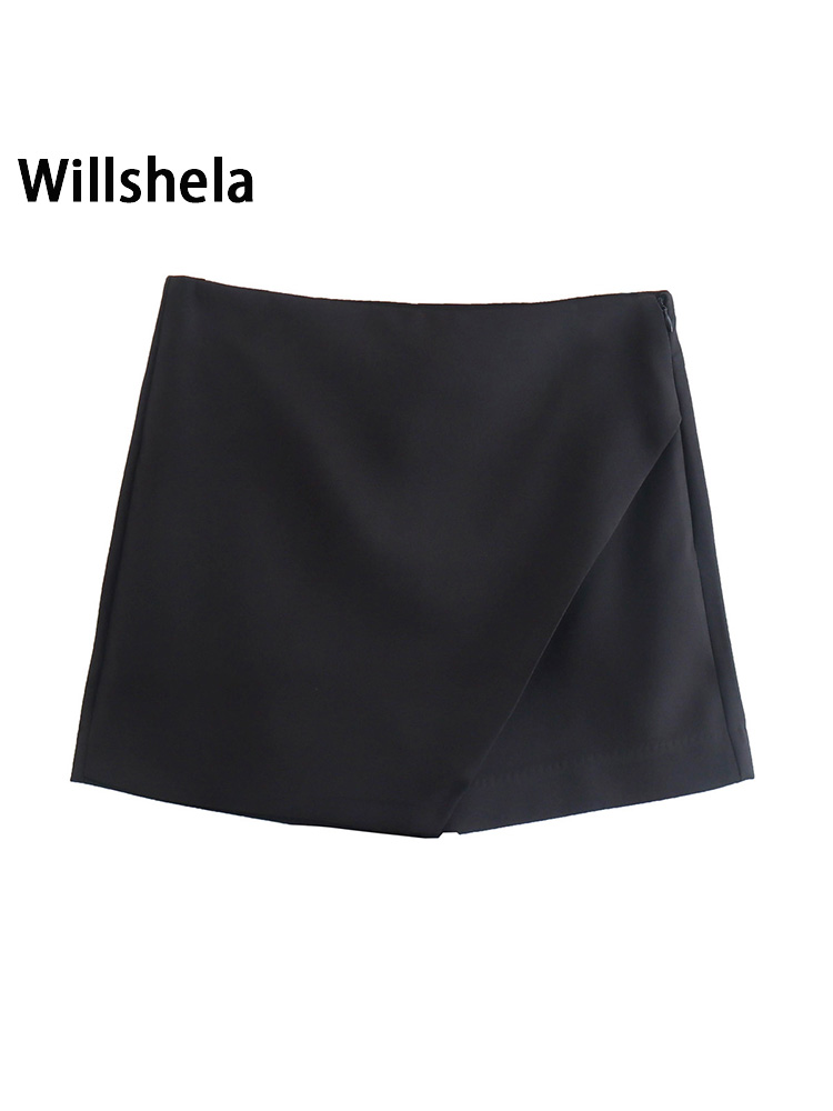 Willshela Women Asymmetrical Shorts Skirts High Waist Back Pockets Side Zipper Vintage Female Skort Solid