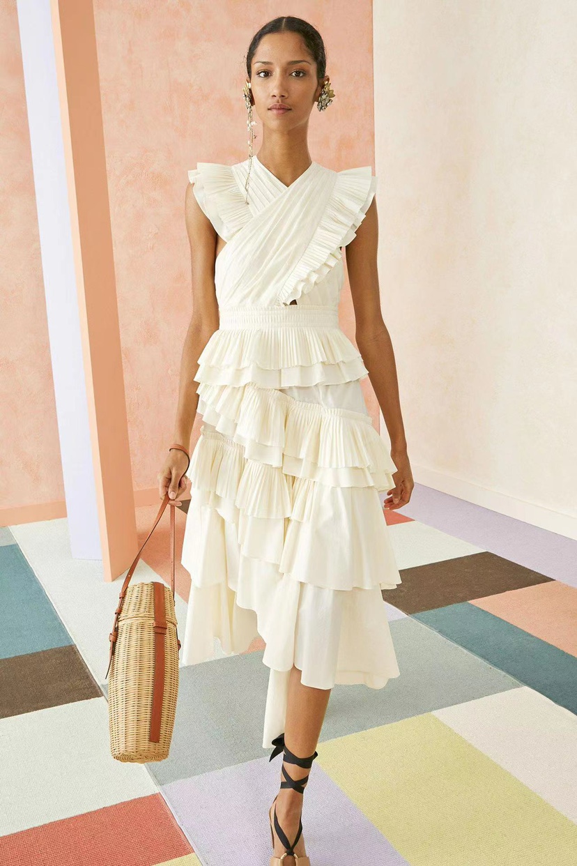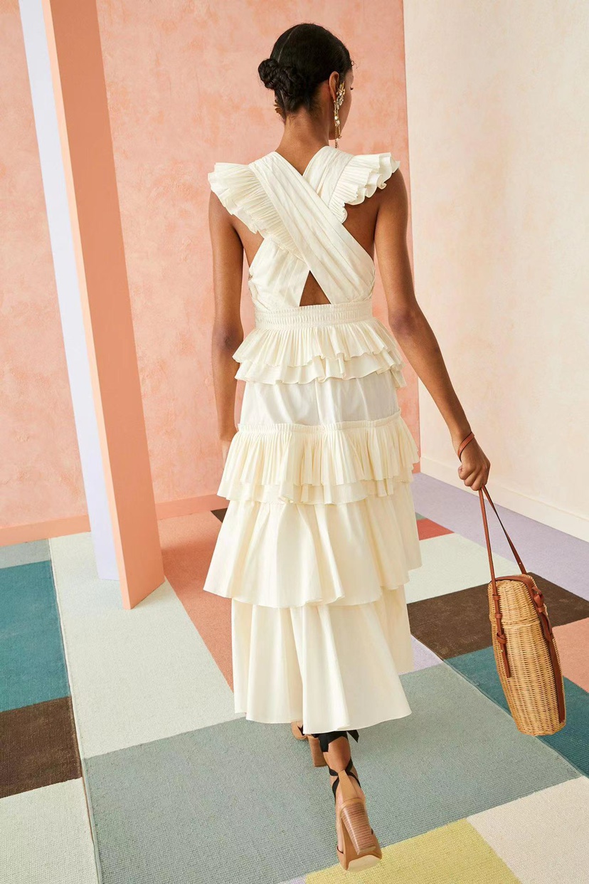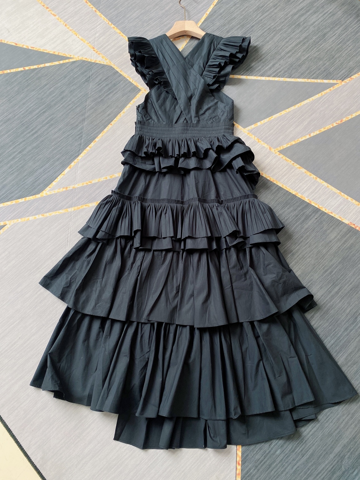 Women Black White Mid-length Dress Sleeveless Ruffle Irregular High Waist Pleated Lady Temperament Robe Party