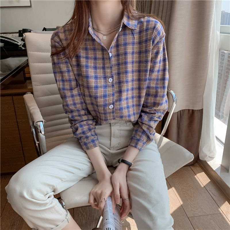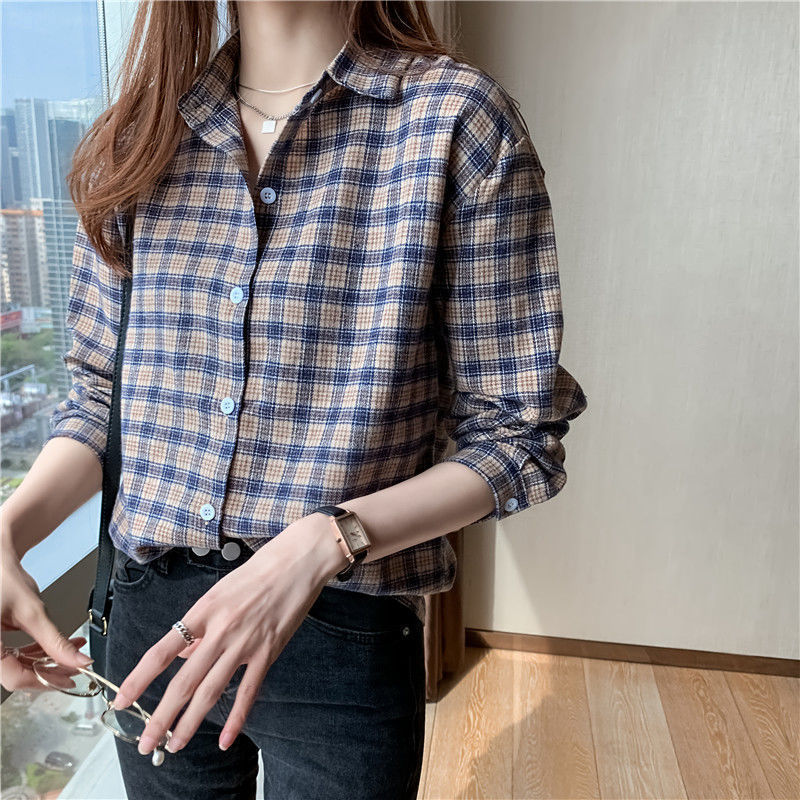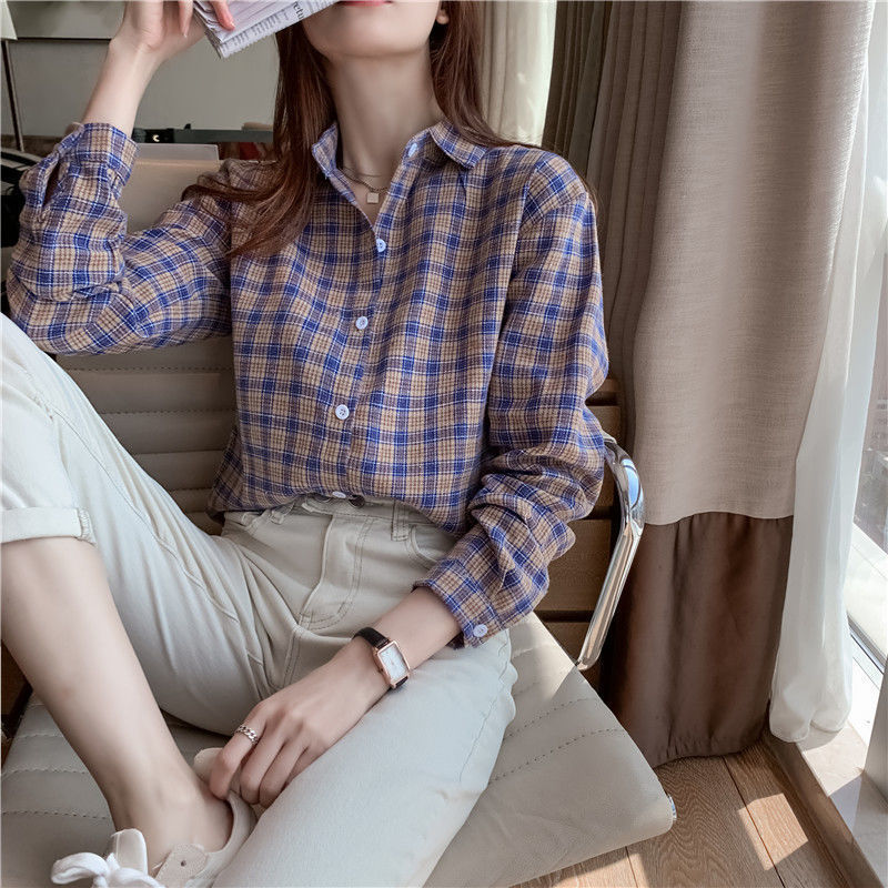 Women Shirt Thin Cotton Single Breasted Slim Office Lady Polo-neck Women's Clothing Long Sleeve Button Plaid Spring Autumn Trend