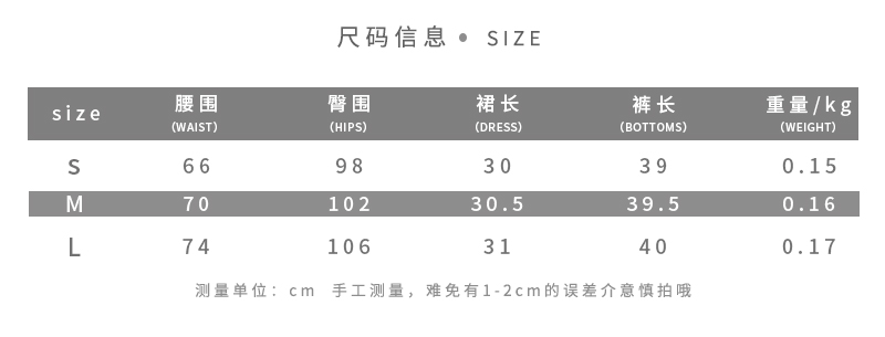 M Waist: 70 Skirt Length: 30.5 Hip: 102 Shorts Length: 39.5
