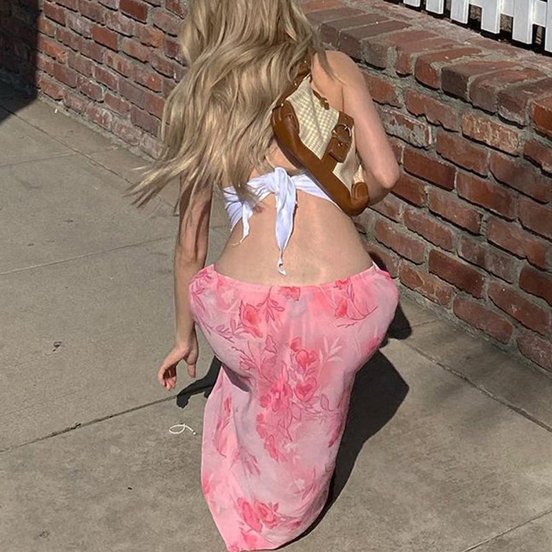 Women Half Dress, Floral Straight Loose Slimming Low Waist Summer Fall Pink Flowing Skirt