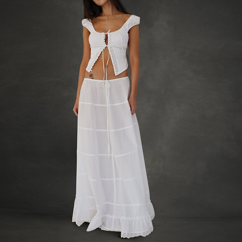 Y2K Fairycore Retro Two Piece Set Women Button Up Lace Trim Milkmaid Tank Crop Top + White Loose Ruffles Skirts Vintage Outfits