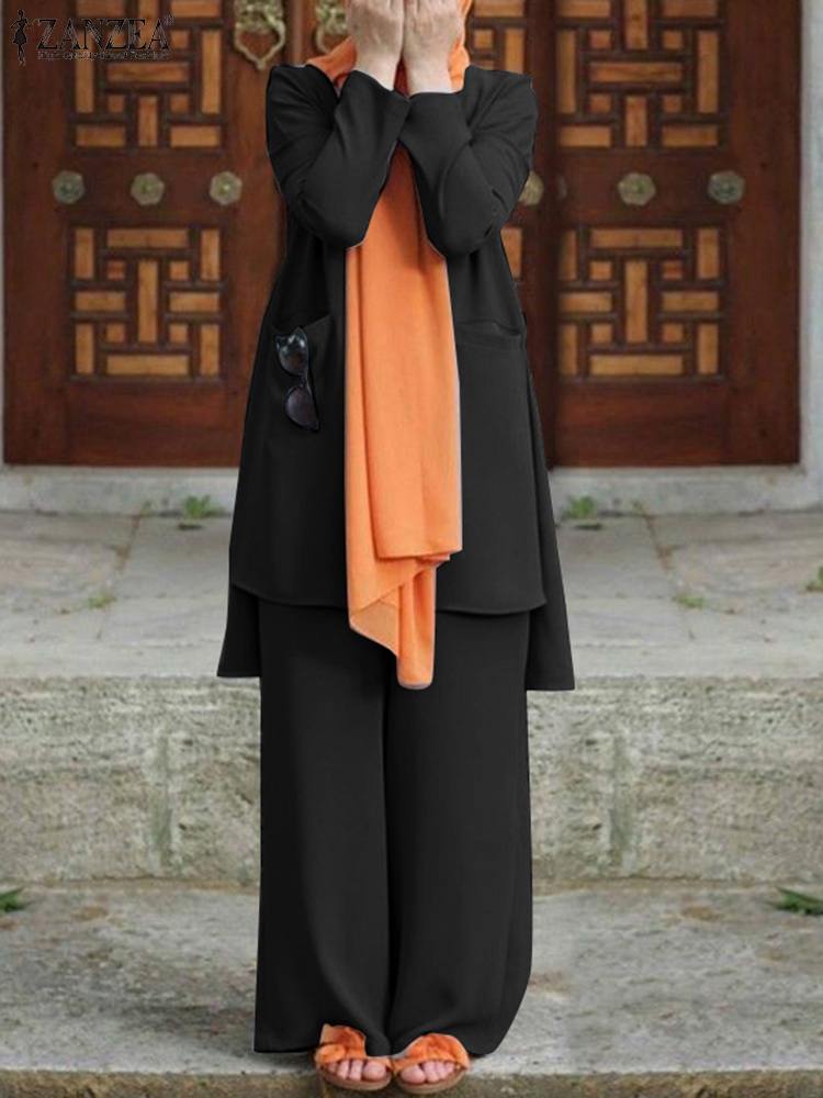 ZANZEA Women 2PCS Casual Abaya Hijab Tracksuit Vintage Muslim Pant Sets Summer Long Sleeve Blouse Suits Loose Matching Sets