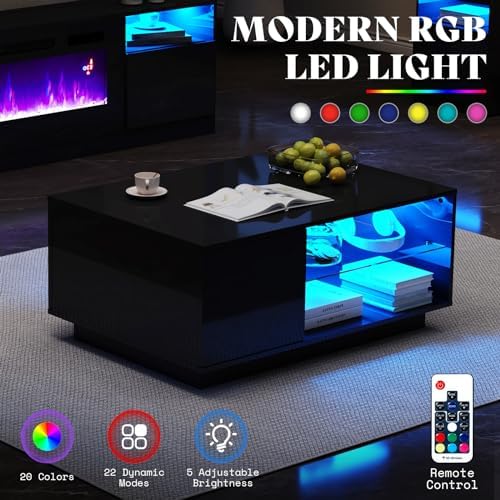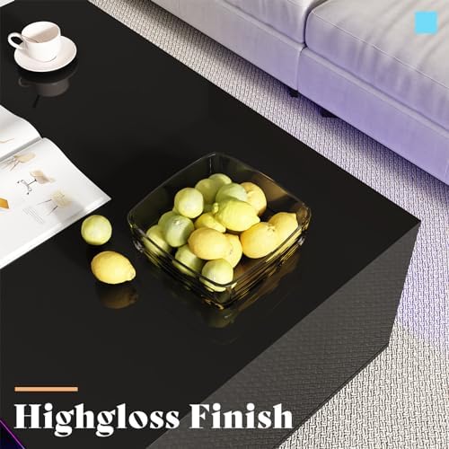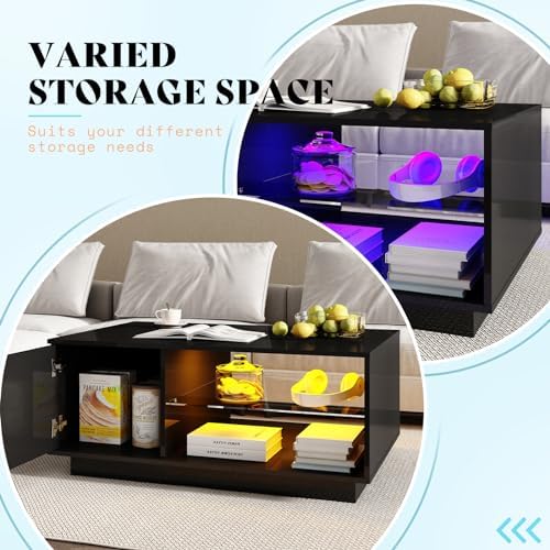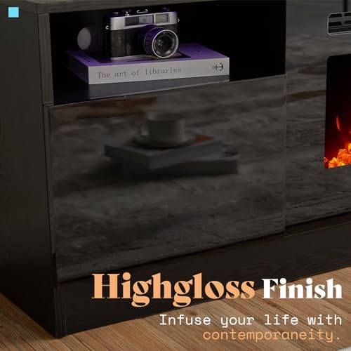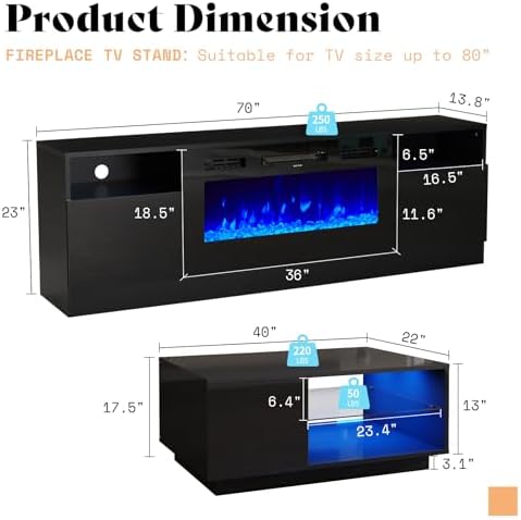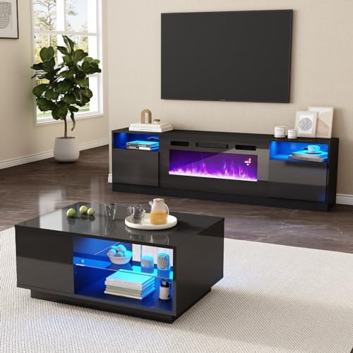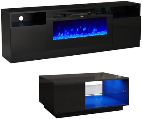 AMERLIFE 2-Piece Modern Living Room Table Sets, Includes 70" Highgloss Fireplace TV Stand, Coffee Table with Glass Shelves, LED Lights Entertainment Center Sets, Black