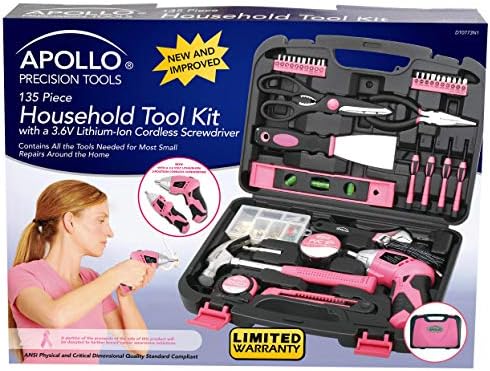 The Apollo Precision Tools DT0773N1 135-Piece Household Pink Tool Kit is a fun, versatile array of tools for small household projects. Featuring a charming pink color scheme and a rugged carrying case, this tidy, multipurpose kit is ideal for a wide variety of general household projects. Tools in the kit, including a steel claw hammer, a utility knife, an adjustable wrench and pliers amongst others, are heat treated and chrome plated for long-lasting durability. Each tool is tested against industry standards for hardness, torque, finish and usability and should last a lifetime under normal use. All the Tools You Need For Small Household ProjectsWhether you're hanging pictures in your new home or assembling a television stand in a dorm room, this kit puts everything you need for light- and medium-duty projects and repairs at your fingertips. Organized in its durable carrying case for quick and easy access, the tools are readily available so you get the job done without scouring through a toolbox.