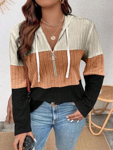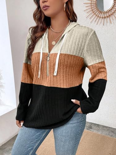 COZYEASE Women's Plus Size Colorblock Half Zip Hoodies Ribbed Knit V Neck Long Sleeve Pullover Sweater