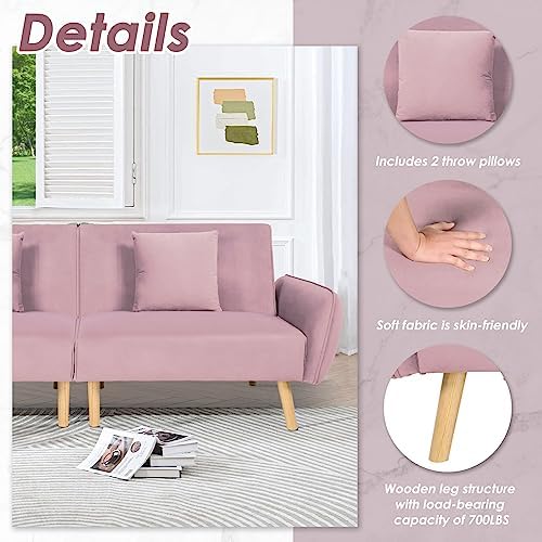 Crownland Futon Sofa Bed, Loveseat Sofa with Velvet Pillows, Mid-Century Modern Style Folding Sofa for Living Room, Bedroom, Apartment (Pink)