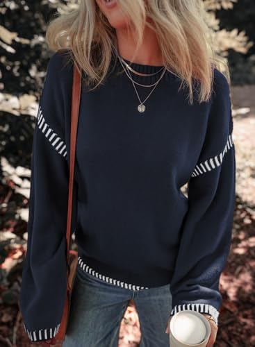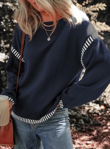 Women's 2024 Fall Fashion Crew Neck Long Sleeve Color Block Knit Loose Pullover Sweater Tops