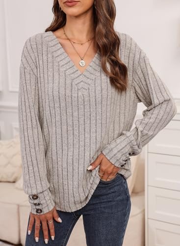 Dokotoo Womens Soft Long Sleeve V Neck Shirts Solid Casual Decorative Buttons Knitted Pullover Tunic Tops
