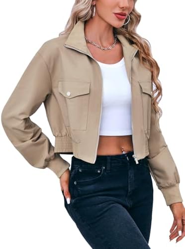 Womens Cropped Bomber Jacket Long Sleeve Zip Up Jackets With Pockets