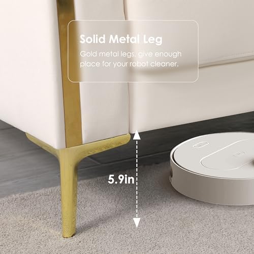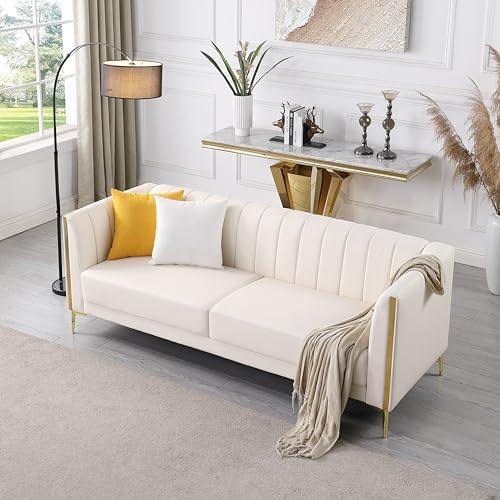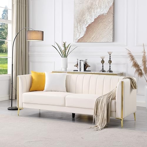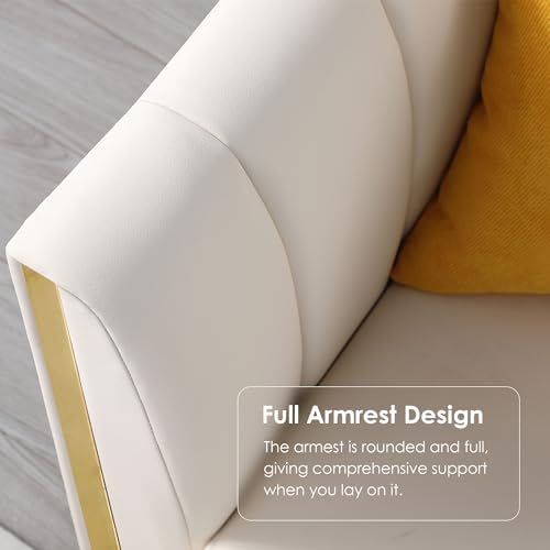 FOTOSOK 78'' Sofa, Modern White Couches for Living Room, Comfy, Faux Leather Sofa 3 Seater Sofa with 2 Throw Pillows and Gold Metal Legs, Deep Seat Sofas (Cream White)