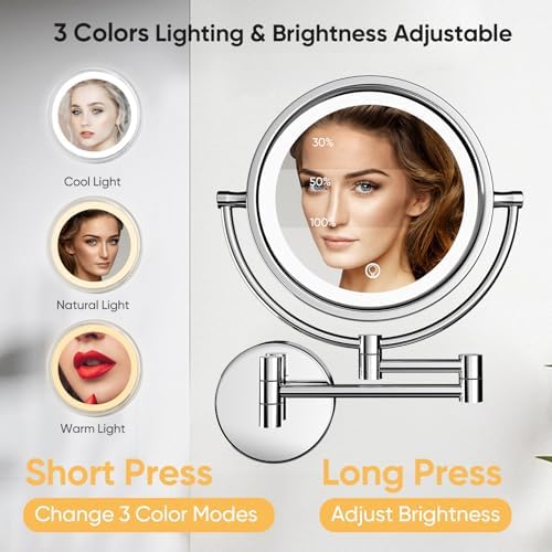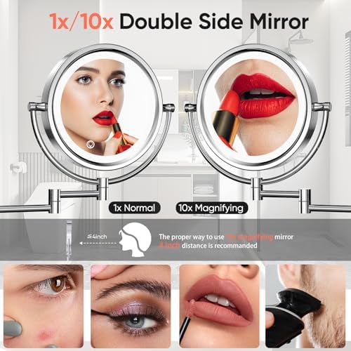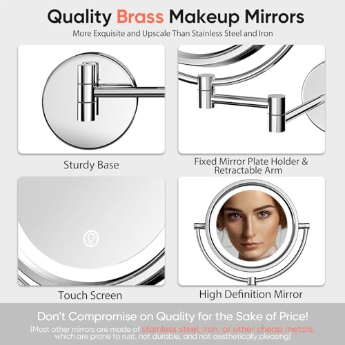GURUN 10x Magnifying Mirror with Light Wall Mounted Makeup Mirror 8 Inch Dimmable 3 Color LED Beauty Mirror Touch Screen Brass Rechargeable Cosmetic Mirror with Extension Arm-Chrome