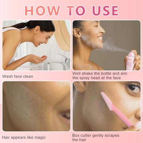 This is a great product. Shows all the fuzz on face and the removal tool makes it easy. Makeup looks much better. No more flaking or cracking. Very gentle on skin. Does not burn or cause irritation. The razors are just right for face. This goes on like a powder that hilites small hairs/fuzz. Light scent. Great value. Really pleased.