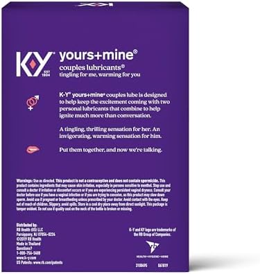 "Mine" is water based lube for women and "Yours" is a glycerin-based lube for men. Take these 2 personal lubes with you wherever you go! Our compact, 1.5 fl oz travel lube bottles are perfect for on-the-go. KY lubricants are the travel accessories you don't want to forget. KY is the #1 Brand in Lubricants & Climax Control* & the #1 Doctor Recommended Personal Lubricant Brand**. KY Yours + Mine water based lubricant for her & warming lube for him - your new favorite additions to your collection. Rest easy knowing that KY Yours + Mine couples lubricants will arrive in discreet, plain packaging — your secret is safe with us. *Nielsen POS $ L52W W/E 4.28.2023. **among vaginal lubricants & moisturizers, IQVIA, ProVoice Survey, Dec. 2022