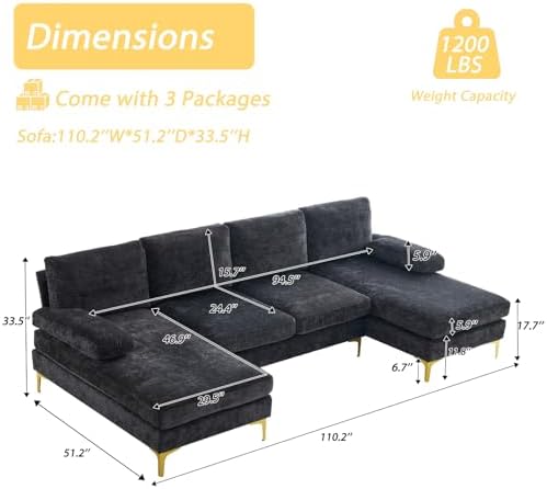 Material: Chenille Fabric, Solid Wood, Metal, Sponge Overall Dimensions: 110.2" L x 51.2"W x 33.5"H Seat Height from the Ground: 17.7" Net Weight: 154.3 lbs Weight Capacity: 1000 lbs