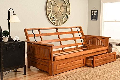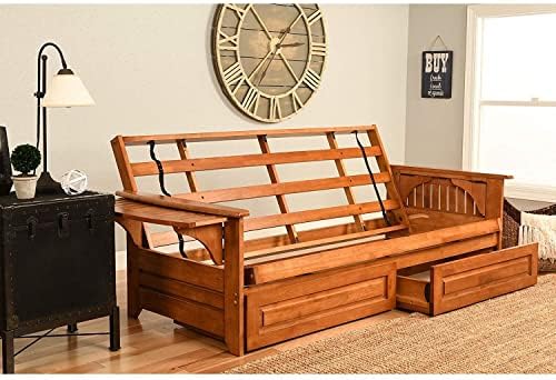 The futon is a classic hardwood frame with tray style arms. This unique and versatile full size futon sofa easily converts to a bed. This multifunctional piece of furniture can find a home in just about any type of room. Mattress dimensions: 75L X 54W X 8H; Frame dimensions: 82L x 37D x 33H.