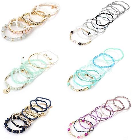 LOYALLOOK 6 Sets Bohemian Stackable Bead Bracelets for Women Stretch Bohemian Style Stretch Multilayered Boho Bracelet Set