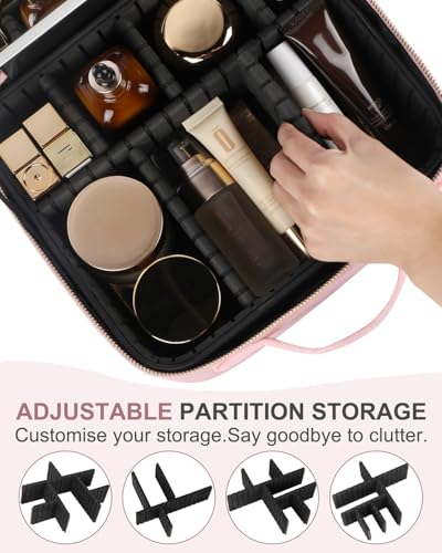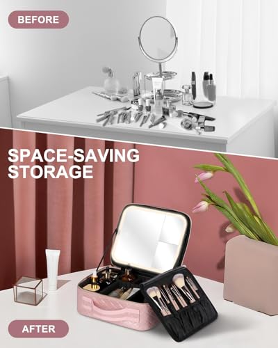 Makeup Bag with LED Mirror and Travel Makeup Train Case Cosmetic Organiser with 2X3X Magnifying Mirror and Separate Makeup Brush Panel, Portable Adjustable Divider Storage Bag, Pink