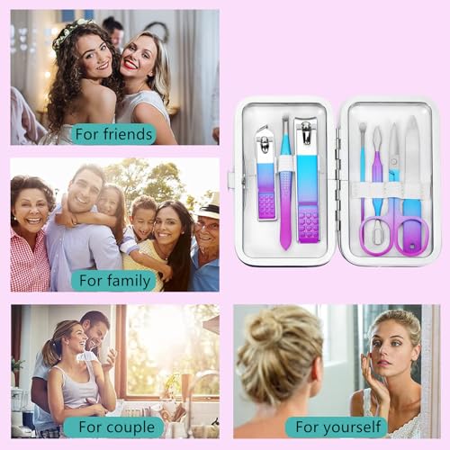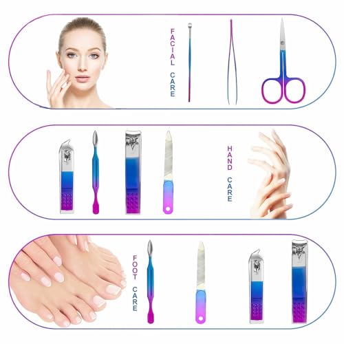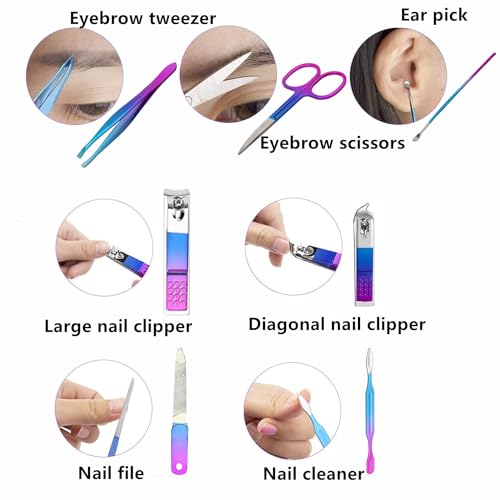 Manicure set contains 7 tools(large nail clipper, small oblique nail clipper, eyebrow scissors, eyebrow tweezer, ear pick, nail file, nail cleaner) for hand, foot and facial care.