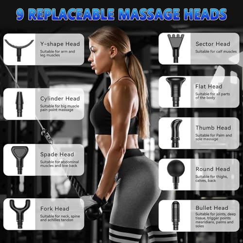 The deep tissue massage gun equipped with 9 massage heads offers versatile and customizable relief for a wide range of body parts. With an array of attachment options, including ball, flat, bullet, fork, and more, users can target specific areas with precision and effectiveness.