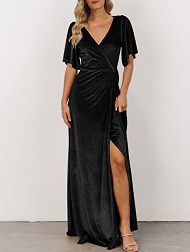 MEROKEETY Women's V Neck Wrap Velvet Maxi Dress Bell Sleeve Split Bridesmaid Cocktail Party Dresses