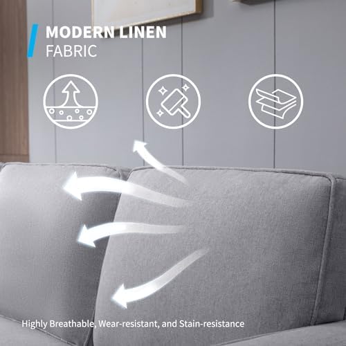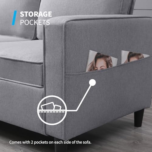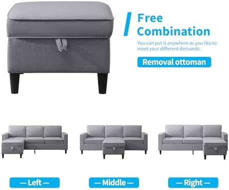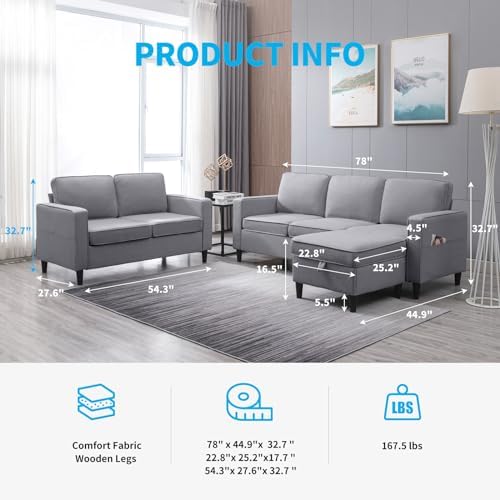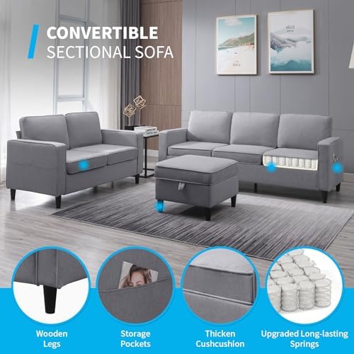 Mjkone 3 PCS Convertible Sectional Sofa Set, Linen Sofa Set with Side Pocket, Couch Set with Storage Ottoman, Furniture Sets in Living Room (Light Grey, Sectional Sofa+Loveseat Sofa Set)