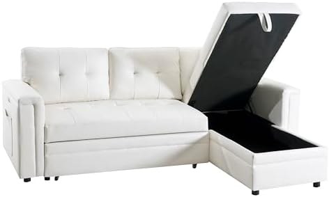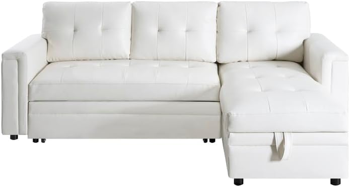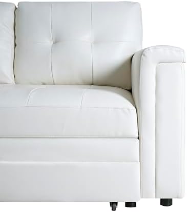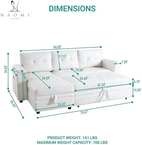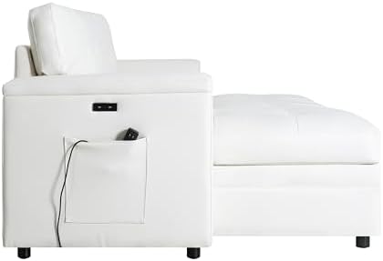 Naomi Home Lily Sectional Sleeper Sofa with USB Ports-L-Shaped Couch Convertible Pull-Out Bed, Ample Storage,Timeless Design,Sturdy Construction,Long-Lasting for Modern Living,White, Air Leather
