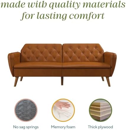 Aside from its bold look, the Novogratz Tallulah Memory Foam Futon Sofa Bed delivers multifaceted appeal on every level. This convertible piece of living room, home office, and guest room furniture embodies mid-century modern sophistication with its vintage shape, rounded edges, and diamond button-tufted back and inner arms. With its buttery soft and easy-to-clean faux leather upholstery, our couch sets itself apart by championing comfort, and nowhere is this more evident than with its high-density foam and memory foam-filled seat cushions, which ease pressure points while simultaneously cradling the body's curves for medium-firm level relief. Featuring an adjustable backrest, padded armrests with piped trim accents, and the ability to transform into a lounger and a bed in seconds, the split-back sofa bed provides supreme convenience for sitting, lounging, and sleeping. Its construction includes a sturdy plywood frame, sag-free spring backing, solid wood corner and center legs, and fold-out plastic bed support legs. Multiple fabric and color options are available.