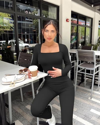 OQQ Long Sleeve Jumpsuits for Women Ribbed Long Sleeve Yoga Bell Bottoms Flare Jumpsuits