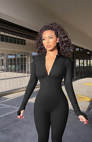 OQQ Women Yoga Jumpsuits Workout Ribbed Long Sleeve Zip Front Sport Jumpsuits