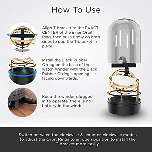 Extremely happy with this orbital watch winder.Very good looking and love watching it orbit.My ladies wrist is very small and the t-shaped holder is flexible and conforms to my band size perfectly. Other reviews complained it did not fit the smaller wrists. This is not true, as it is flexible, as advertized, & I was able to fit it to my small wrist band with ease, just squeeze.I've purchased 2 of these Orbit winders. I use one for my Rolex & one for my Omega and the Orbit keeps them wound. The watches are so pretty on display under the glass and love to watch them rotate in the gyro motion. I like sparkle.Other reviews said t-shaped holder was difficult to insert. I just line it up, apply some pressure and it snaps in place. It has to be tight to stay in place & hold the weight of the watch.Orbit is very quiet and I'm not aware it is running.It operates just like advertized, on for 2 minutes, off for 8 minutes. I love glancing over & seeing it orbit.I think this was a fantastic purchase, the reason I now have 2.