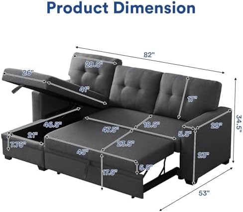 Rovibek 4-in-1 Convertible L Shaped Couch with Pull Out Bed and Storage Sectional Sleeper Sofa with Reversible Chaise for Living Room, Apartment, Bedroom, Office, Charcoal Grey