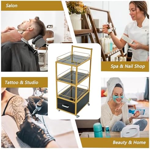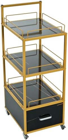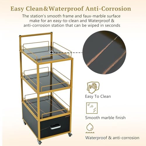 1. 4 sturdy metal and hard rubber casters, 360° swivel and lockable, Easy to move. 2.This salon station has three levels of marbled wood board storage with a drawer at the bottom. Metal guardrails prevent items from falling. 3.3 Open Shelves for Storage & 1 drawer, plenty of space for you to store various items and tools, each shelving carrying up to 130 lbs (evenly distributed).