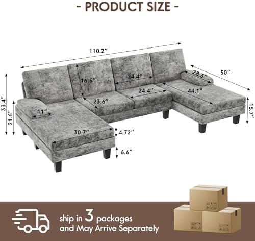 Shahoo U-Shaped Sofa Feature: Shahoo Sectional Couch Living Room Sets, Chenille Fabric U-Shaped Sofa with Double Chaises, Dark Gray. Specification Color: Dark Gray Material: Wood, Chenille Fabric, etc Package Dimensions:110"(L) x 44.1"(W) x 33.4"(H) Package includes: A sofa A tool kit A manual of installation and usage Notice: There may be some differences between photos and items in term of color because the influence of lighting during the shooting or the settings of the computers’ display screen.