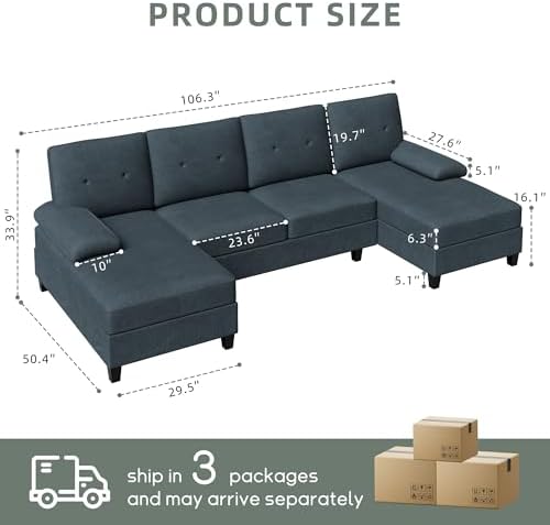 Pros: fast shipping, affordable price, easy to put together, comfortable yet firm cushions, okay material (I have mine covered with blankets to keep my cats from scratching it)Cons: Color is supposedly dark gray but it has a greenish tint to it. It’s not an issue for me since I have it covered but it may be for others.72 hours later and I am still waiting for it to expand fully. I broke out my hairdryer to help the process along. It even got rid of very deep pressure indentations that I was sure would not be fixable. With some gentle tugging on the foam while holding heat directly on it I was able to fix all of them. It is very time consuming but worth it. I highly recommend giving this a try.One zipper broke off an arm rest while installing. I’m going to just add Velcro to secure it. Replacing the zipper isn’t possible with a plastic track. I’d have to remove the entire plastic track and sew a new one on, then attach the new zipper pull. That’s not happening.It is extremely low to the floor. Way too low for my husband and myself (I’m 5’7” he is 6’1”), however, I am going to replace all 12 legs with taller ones. The feet that come with it are 4 inches. I’m going with 8 inch replacements (at my own additional cost)I’m also adding more Velcro to the cushions so they stay put.So, after all that’s said and done I’m spending an additional $100+ to make it usable for my family. It is still cheaper than any u-shaped couch I can find in the DC area.Update: after changing the legs to 8 inch ones and using the hair dryer to get the cushions fully expanded, we are much happier with our purchase. Adding a star to my original review