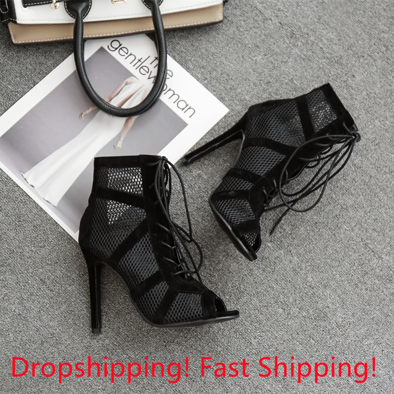 show Black Net Fabric Cross strap Sexy high heel Sandals Woman shoes Pumps Lace-up Peep Toe Sandals Casual Mesh