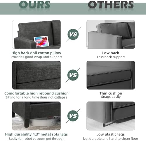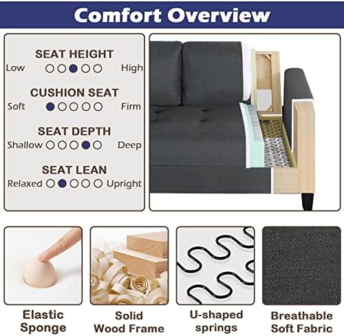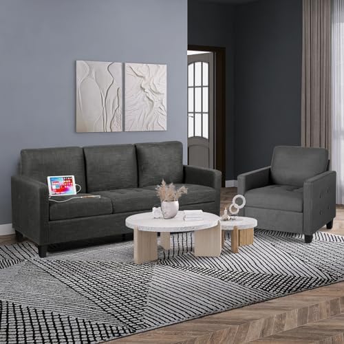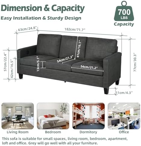 STHOUYN 72" W 3 Seater Couch Sofa with USB Ports, Grey Comfy Couches for Small Spaces, Mid Century Modern Gray Couch for Living Room Apartment Bedroom (Dark Grey)