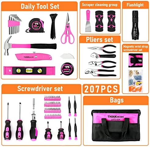 THINKWORK Pink Tool Set - 207 Piece Lady's Portable Home Repairing Tool Kit with 13'' Wide Mouth Open Storage Tool Bag, Perfect for DIY, Home Maintenance - Christmas Gift for Women, LHTS-034