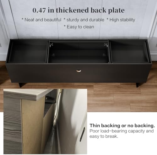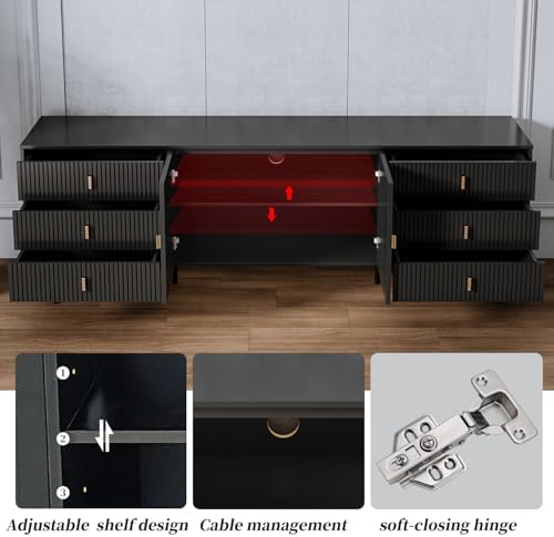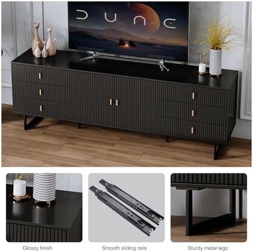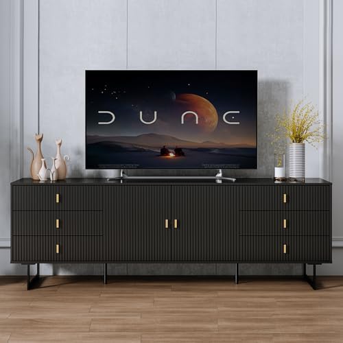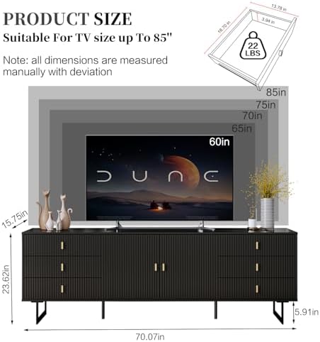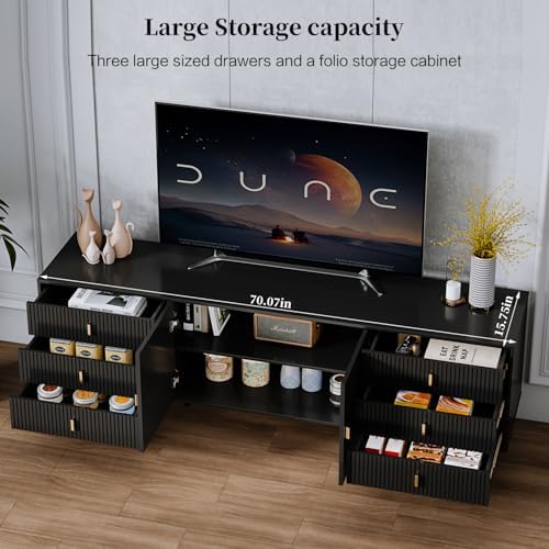 70 inch TV stand/entertainment centerThe top platform of the TV stand is suitable for storing TVs, picture frames and decorative items.The six drawers on either end can be used to store Blu-ray disks, cords, books and other small items. These drawers are usually designed with slides for easy opening and closing.Behind the center cabinet door you can store other media devices thatSuch. Enclosed storage can help keep items neat and organized, preventing dust, moisture, and other external elements from damaging stored items.