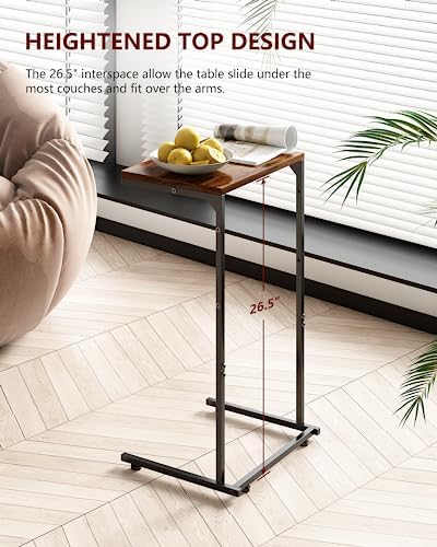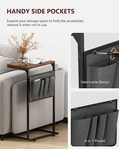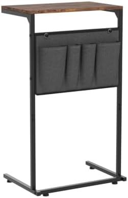 I bought because this was on sale but I did compare it to other options before purchasing. I liked the 28 inch height clearance which is good for both the chair in the photo and the sofa in this room where we may also use it. It was easy to put together and the allen wrench is included so you can put it together without any additional tools. I liked the size of the table top and the fabric organizer so the surface can be kept clear. Note, it's not reasonable to easily reach the lower organizer pockets while sitting in the chair or the sofa, so this feature isn't going to be useful to everyone. It does have feet that slide but remains in place for me unless I want to move it. For the price, the quality is excellent and I'm very pleased with my purchase.It was well packaged, including protectors for the corners of the tabletop inside the box. All parts were in bags and labeled. The instructions are pretty simple and the letters and numbers of parts were correct. The metal and wood were not scratched or damaged. All holes lined up for assembly.