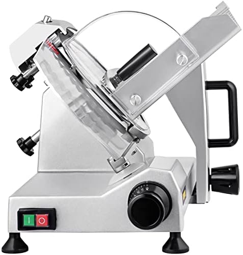 This food slicer is made of cast aluminum body and 8.7'' chromium-plated steel blade, with a painted surface, corrosion and rust-proof. The 240W powerful motor provides high-efficient production. An equipped regulator can adjust the thick of slicers between 0-0.47 inch/0-12 mm. It adopts a detachable design for easy cleaning. It is a perfect turkey deli meat slicer, bread slicer, deli slicer, and salad shooter.