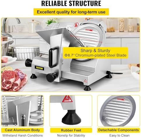 The body is made of cast aluminum, and the 8.7-inch diameter blade is built with chromium-plated steel for corrosion and rust-proof. The sharp edge of the blade allows quick meat slicing. The groove cutting surface effectively keeps the meat from remaining on the blade.