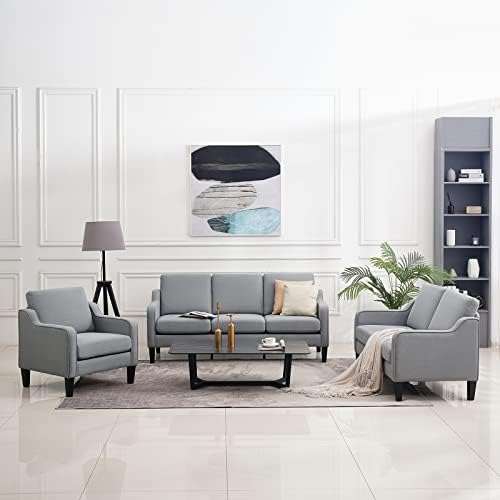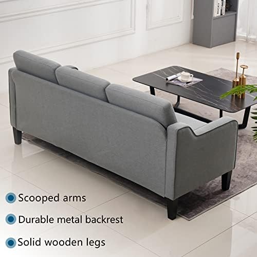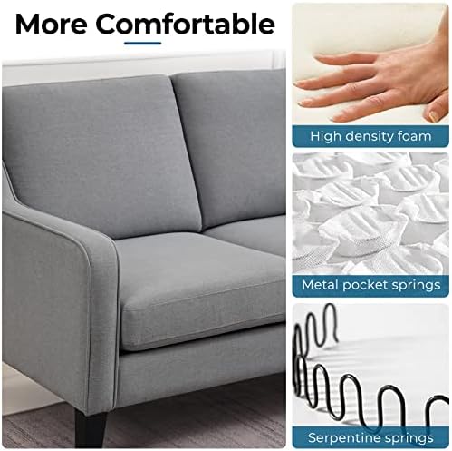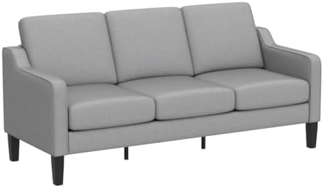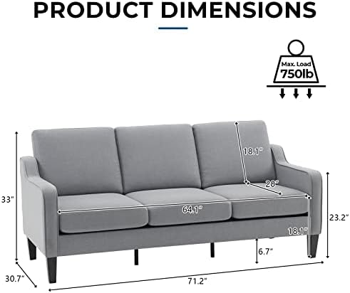 I rent the upstairs from a friend's mom so my review is for a smallish type of living space and this sofa is replacing an aged futon. The sofa is the same width as the futon and looks really cute, although the color does have a slight bluish tint to it. Putting together is SUPER easy. Everything screws in by a hex key or a knob. Took me almost exactly one hour by myself from pushing the box up the stairs to moving it where I wanted it. Assembly is a breeze, but if you can't lift heavy weight get some help as the box is hefty before opened. It's not expensive and doesn't pretend to be, but the cushions are a nice medium firmness so good support and it's comfortable and seems sturdy enough. If you're looking for a cheap option for a garage or something like a guest area, this thing is great! One thing I will say is to be sure to take your time to make sure everything is lined up and secured properly and follow the directions. Otherwise you may end up with some crooked pieces. Other people in the reviews complained about that, but I really think they were either frustrated, in a hurry, or both. I did this while watching TV in the living room so not much space is needed for assembly. I will give this a month or two then maybe consider ordering the matching chair to replace my red one that now does not match. Great value for under 250 dollars!