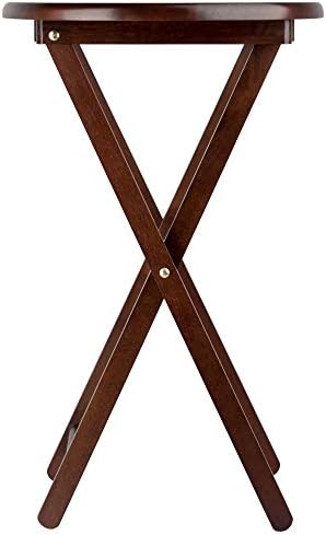 Make entertaining simple and easy with the Winsome Wood Nathan 5-Piece Snack Table Set. This versatile set includes four tables and for convenience a storage rack to store your tables out of the way when not in use. The oval shape of these snack tables makes these distinctive and stylish. Ideal for setting out appetizers at a party, enjoying a meal while relaxing on the sofa, or for working on your laptop. This set of foldable tables open up to X-frame bases which make these table not only look good but also help with stability. Tables easily open up, with a wood stopper on the other end helping the legs stay standing. Great for daily use and compact enough to store in the closet. Constructed of solid wood, the rich cappuccino finish brings out the warmth of the wood grain. Conveniently packed and shipped in 1 box. Tables arrive ready to use and require no assembly. Minimal assembly is required for stand. Replacement part request can be submitted directly to the manufacturer within 60 days from date of purchase. Individual Table Size: 20.7"W x 15.8"D x 25.5"H (open) Individual Table Size (closed): 20.7"W x 2"D x 29"H Dimensions of Stand with tables stored: 23.7"W x 12.9"D x 31.3"H Static Maximum Weight per Table: 25 lbs. Tables come fully assembled Storage Stand requires assembly Ships in 1 box