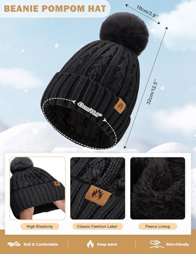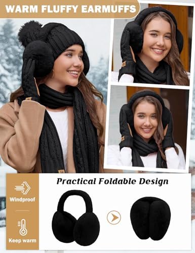 Women Winter 5PCS Beanie Hat Scarf Touch Screen Gloves Ear Muffs Socks 5 in 1 Set Thick Faux Fur Warm Cap for Cold Weather
