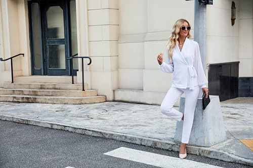 Elegant Long Sleeve Tie Waist Blazer Pant Suits Dressy Outfits for Business Formal Occasion. White Party Outfits.
