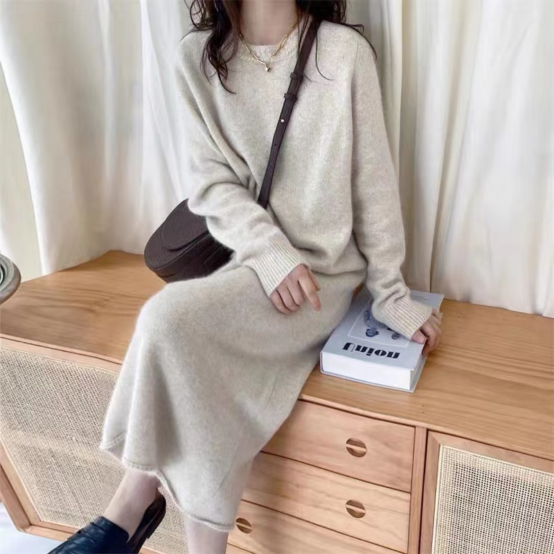 wool long dress women's O-Neck Wool sweater solid color loose bottoming long skirt long high-end Wool dress