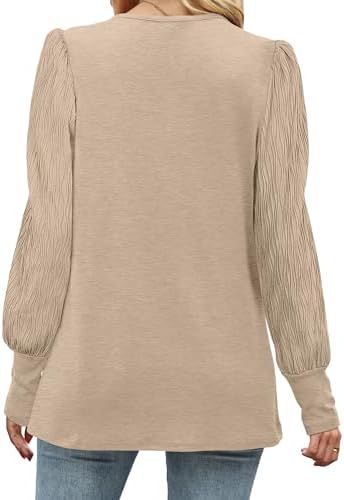 XIEERDUO Women's Long Sleeve Shirts Pleated Crew Neck Puff Sleeve Tunic Tops