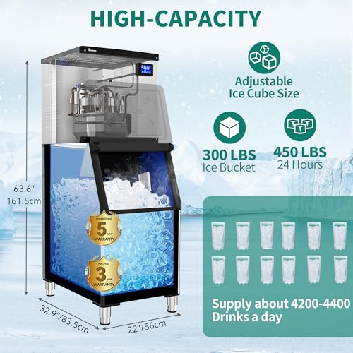 EFFICIENT ICE PRODUCTION & AIR COOLED DESIGN: Say goodbye to ice shortages with our industrial ice maker, capable of producing over 450 lbs ice within 24 hours and can store 300 lbs, 156 ice cubes can be produced in 5-15 minutes, our air-cooled ice maker required low water and energy consumption with minimal environmental impact, four cooling fans by the side of the unit for rapid and efficient heat dissipation