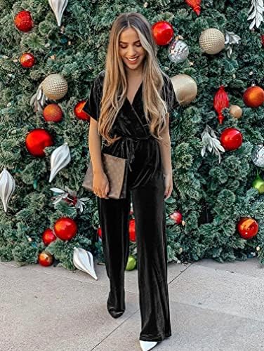 - Features: bateing half sleeve,long pant, jumpsuit, wide leg ,side pockets, high waist, elastic waist, waist tie, short sleeves, deep V-neck, solid color fabric, the surface of the fabric has a layer of shiny fluff, making the whole dress more elegant ,noble.